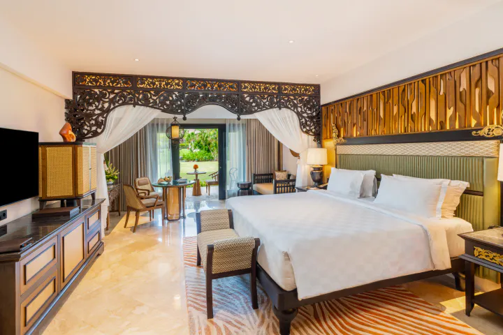 The 104-square-meter Two Bedroom Resort View Rooms are crafted to offer a luxurious and relaxing getaway. Each room includes a private terrace with cushioned daybeds, hand-carved wooden furnishings by local artisans, and a deep-soaking bathtub in a marbled bathroom. The spacious layout features uniquely crafted interiors that reflect Balinese spirituality, creating an authentic relaxation experience. The meticulously tended garden views and thoughtful room designs provide an ideal retreat for families or larger groups traveling together. This special holiday experience is enhanced by exclusive resort offerings, including priority access to Rock Bar, ensuring enjoyment and convenience.
