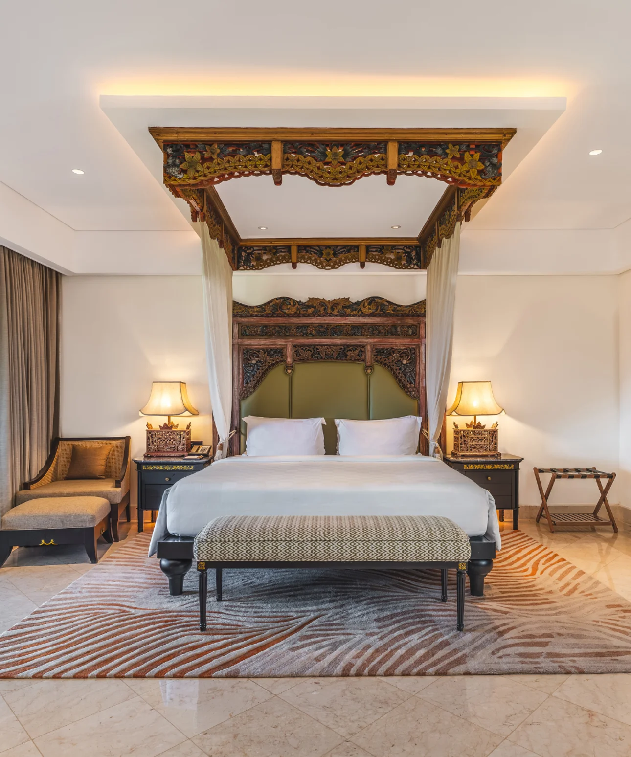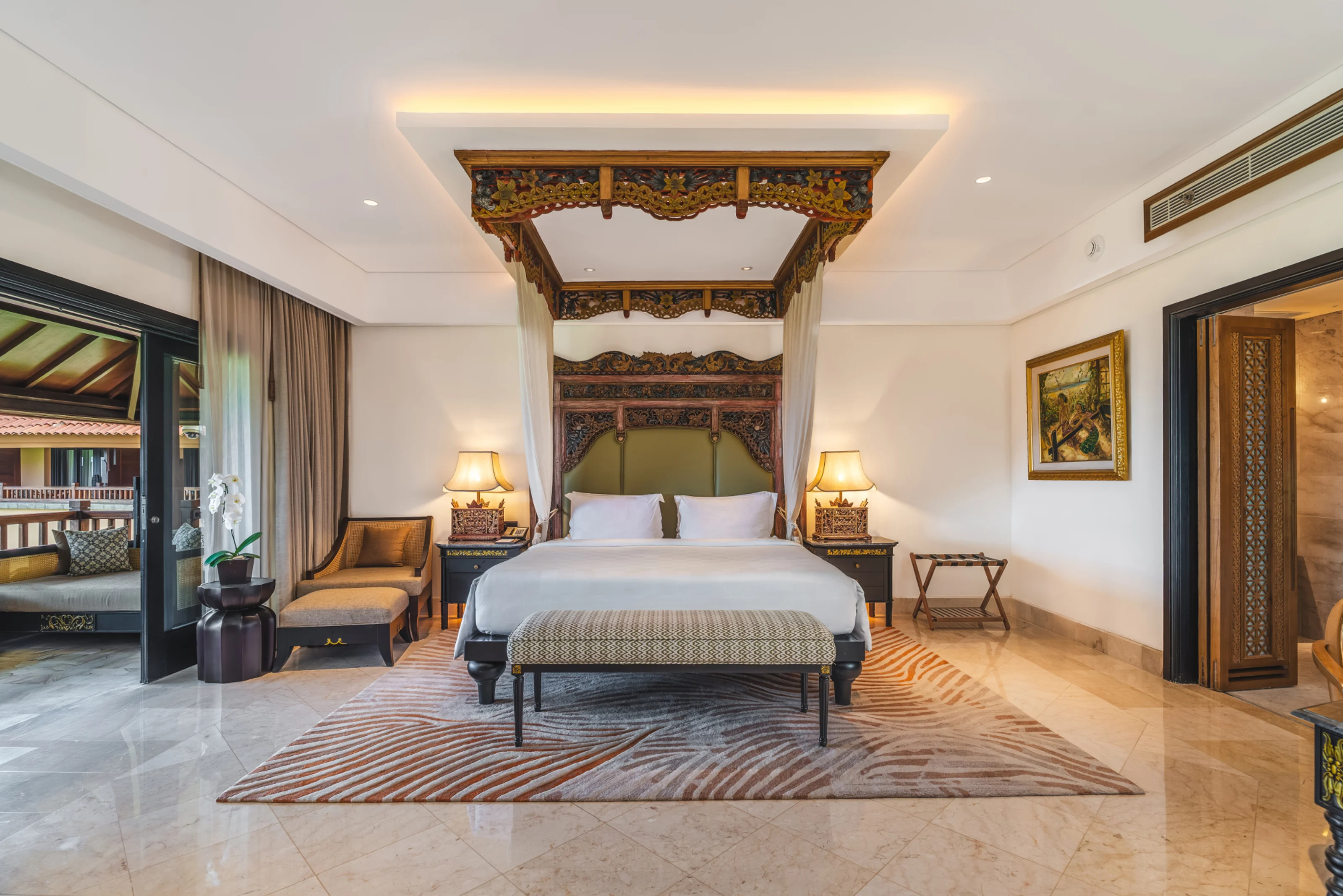 king-size canopy bed. The living room offers a plush L-shaped lounge sofa and a plasma TV for ultimate relaxation, while two marble bathrooms add a touch of convenience and luxury. Unique