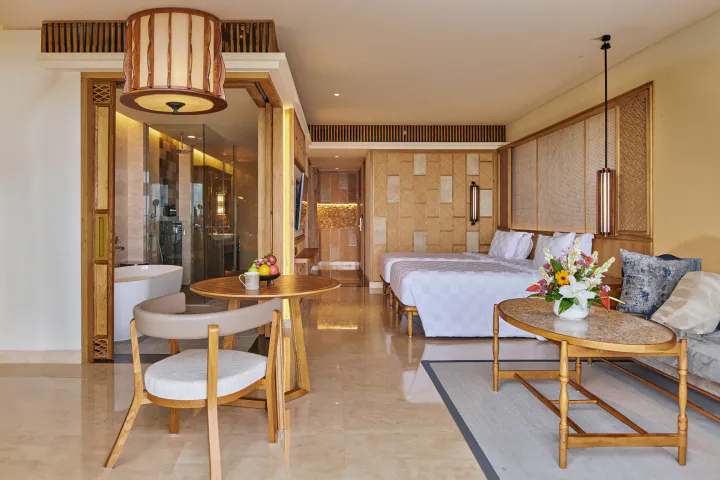 extending to the ocean, the suites are adorned with Balinese motifs, hand-carved wood accents, wooden furnishings, fine linens, and spa-like bathrooms that embody true Balinese relaxation. Unique offerings, such as priority access to Rock Bar make this a special holiday experience.