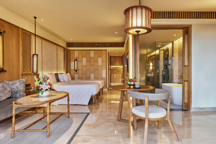 merging with nature. Whether lounging on a daybed on the terrace with green resort views or unwinding in a deep soaking tub, guests experience true relaxation. The sleek lines of rustic wooden furniture paired with warm lighting highlight the Balinese charm within modern design. Unique offerings, such as priority access to Rock Bar make this a special holiday experience.