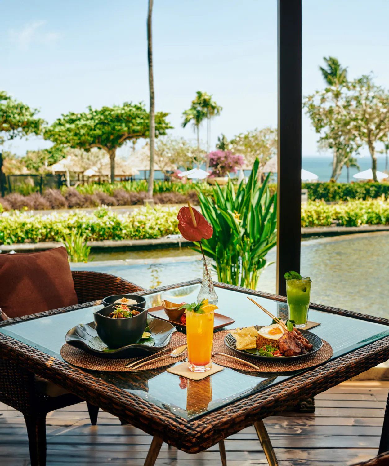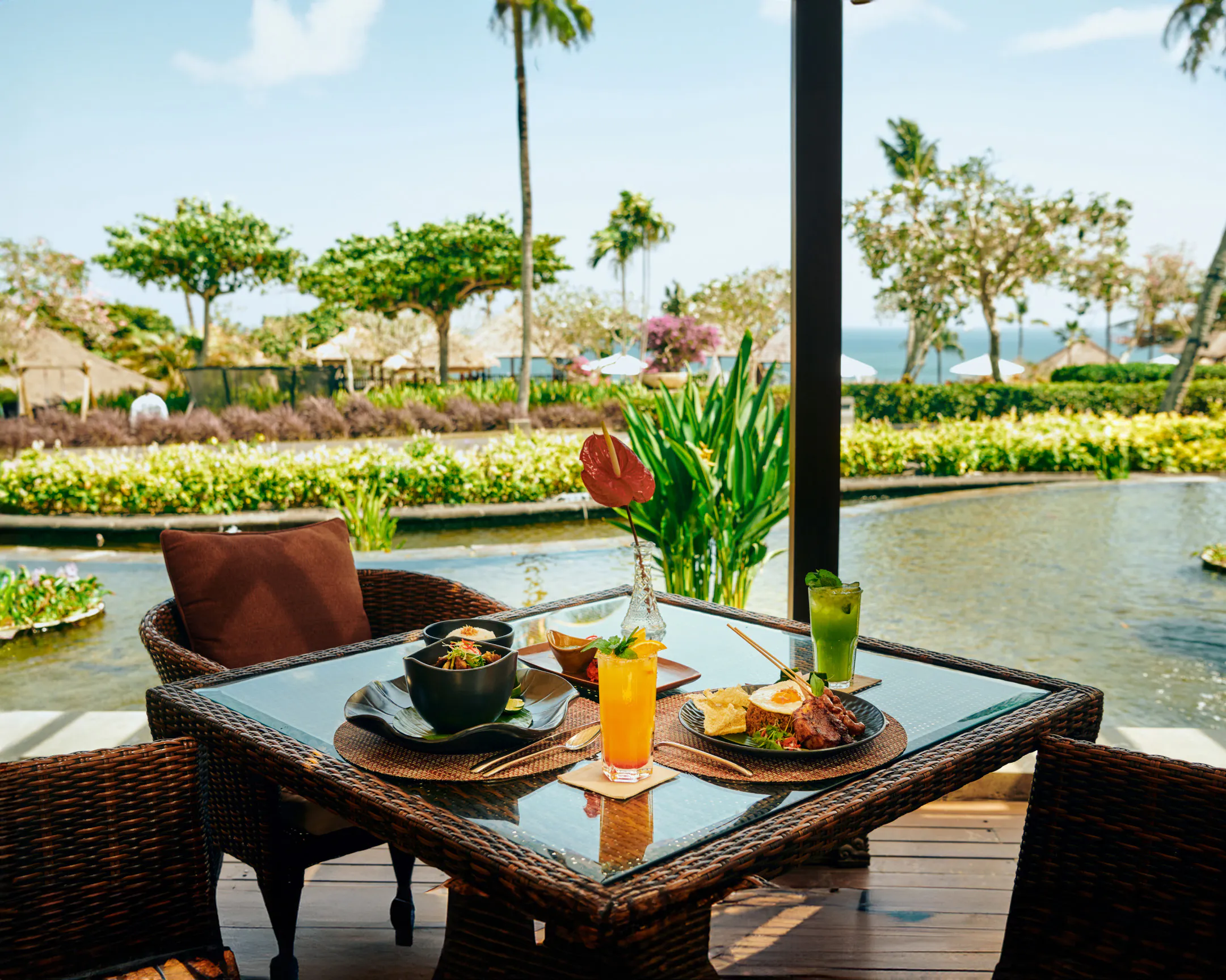 Damar Terrace Bar & Lounge offers a retreat from the sun and vibrant hotel activities. Set amidst enchanting fountains and serene lotus pools, this open-air bar provides the perfect sanctuary for unwinding during a leisurely afternoon or relaxing evening.