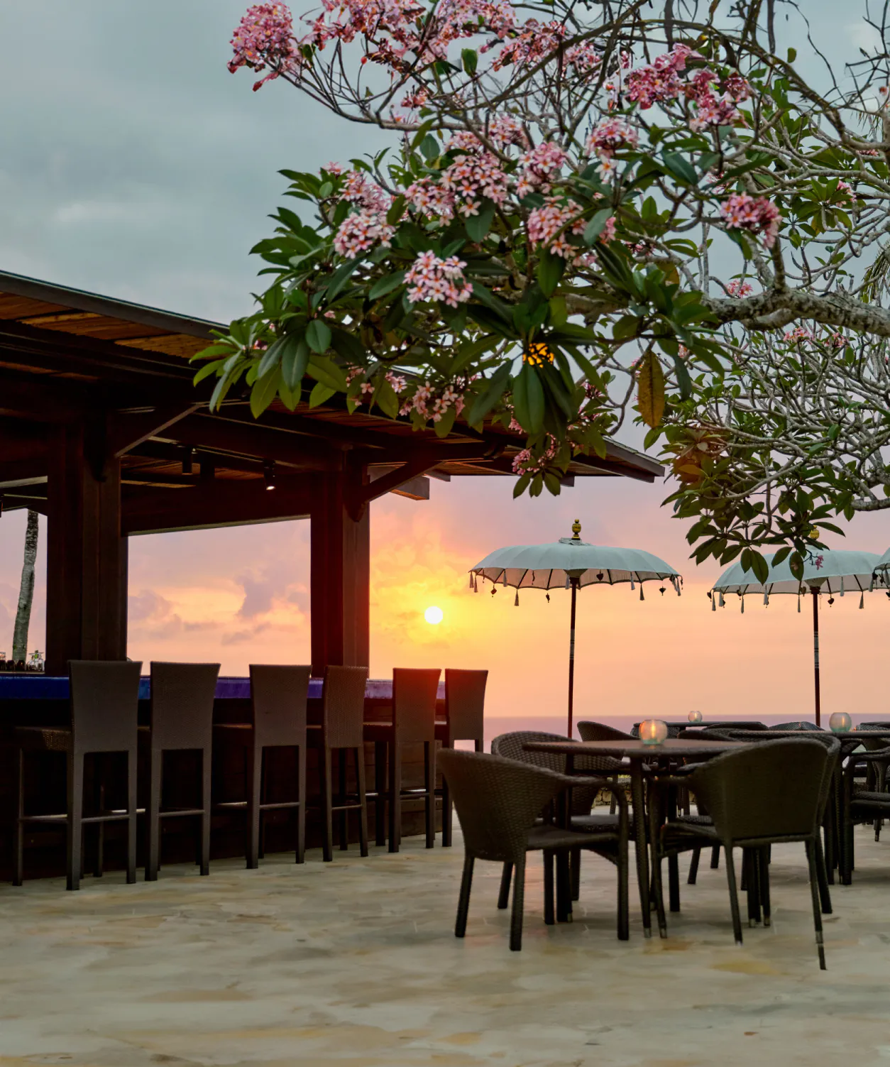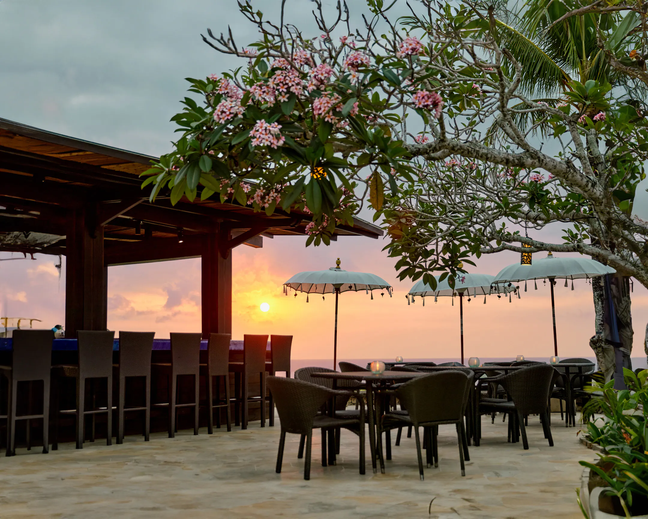 Sunset Bar is a special spot where you can relax while watching the beautiful sunset over the Indian Ocean. Enjoy delicious cocktails amidst the stunning scenery, embracing the natural beauty of Bali. It's the perfect place for a romantic evening.