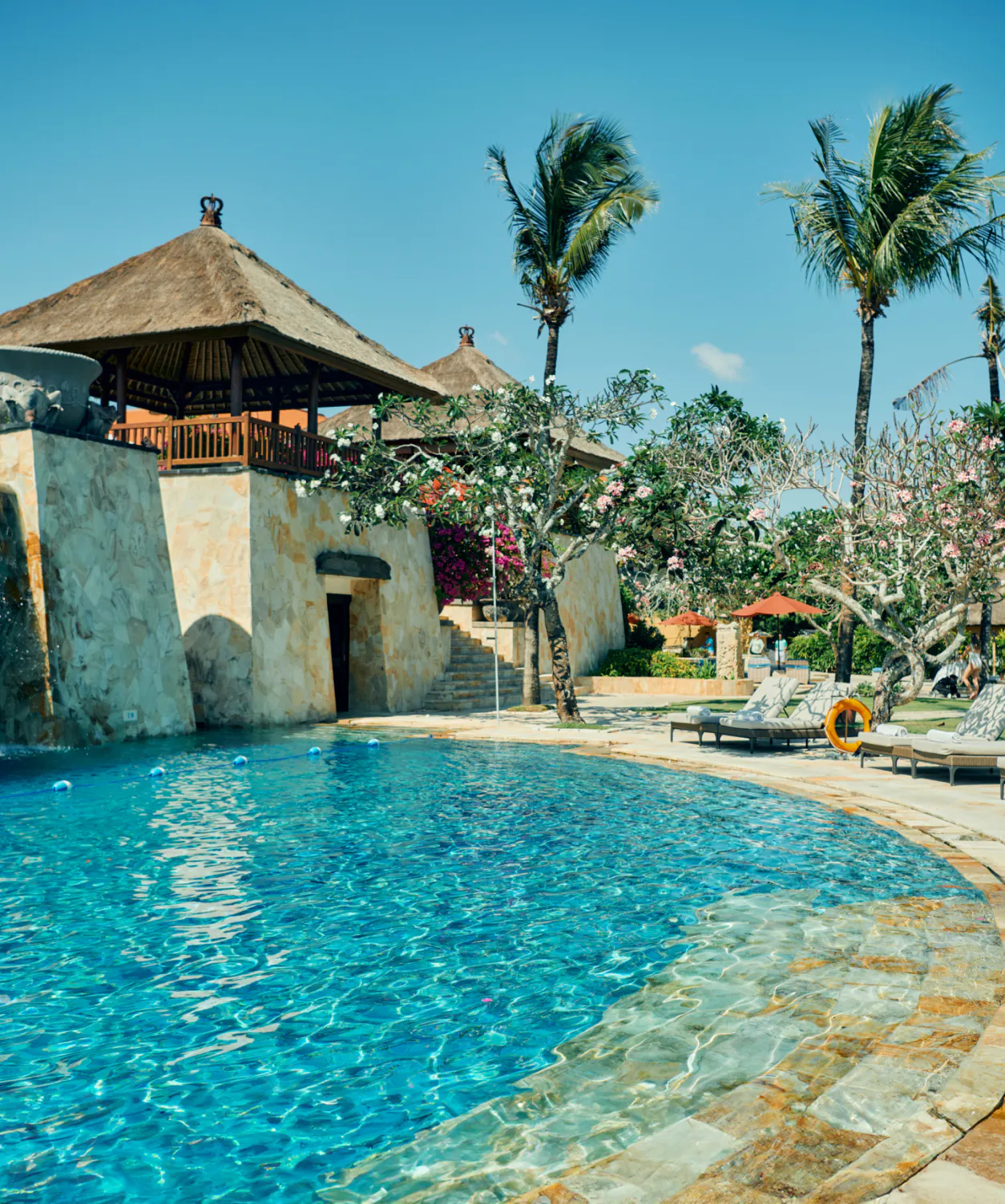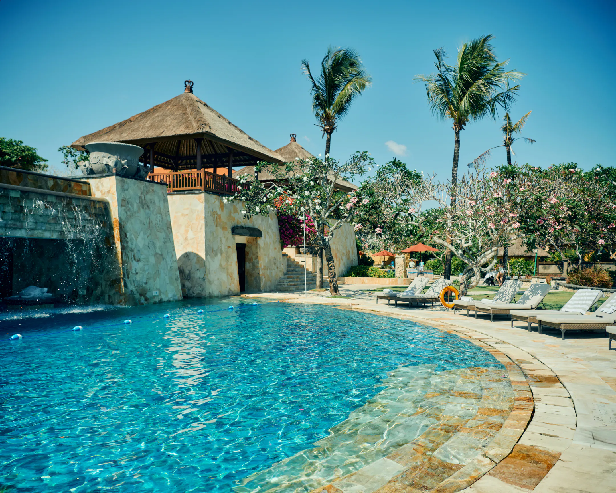 The AYANA Lower Pool, located below the main pool, offers a refreshing and tranquil atmosphere with a view of the waterfall cascading down from the upper pool.