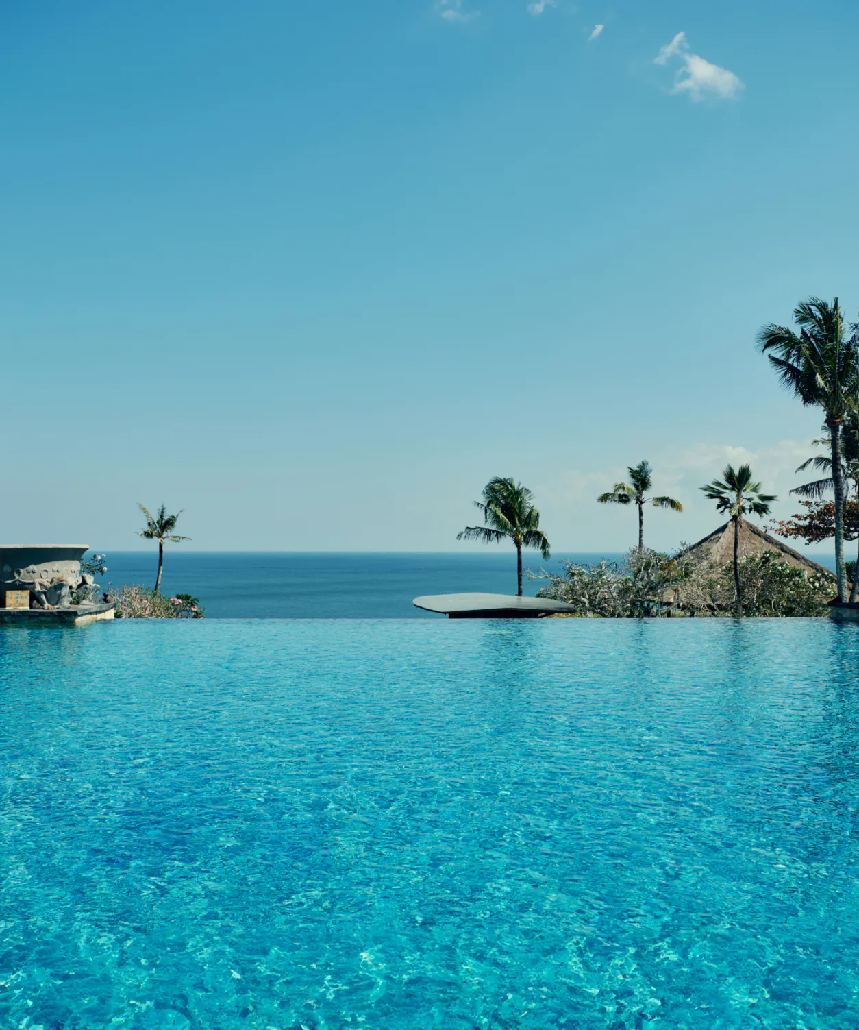 The expansive outdoor freshwater pool boasts a two-level design with both upper and lower tiers, and features a stunning infinity edge that seamlessly blends into the sea.