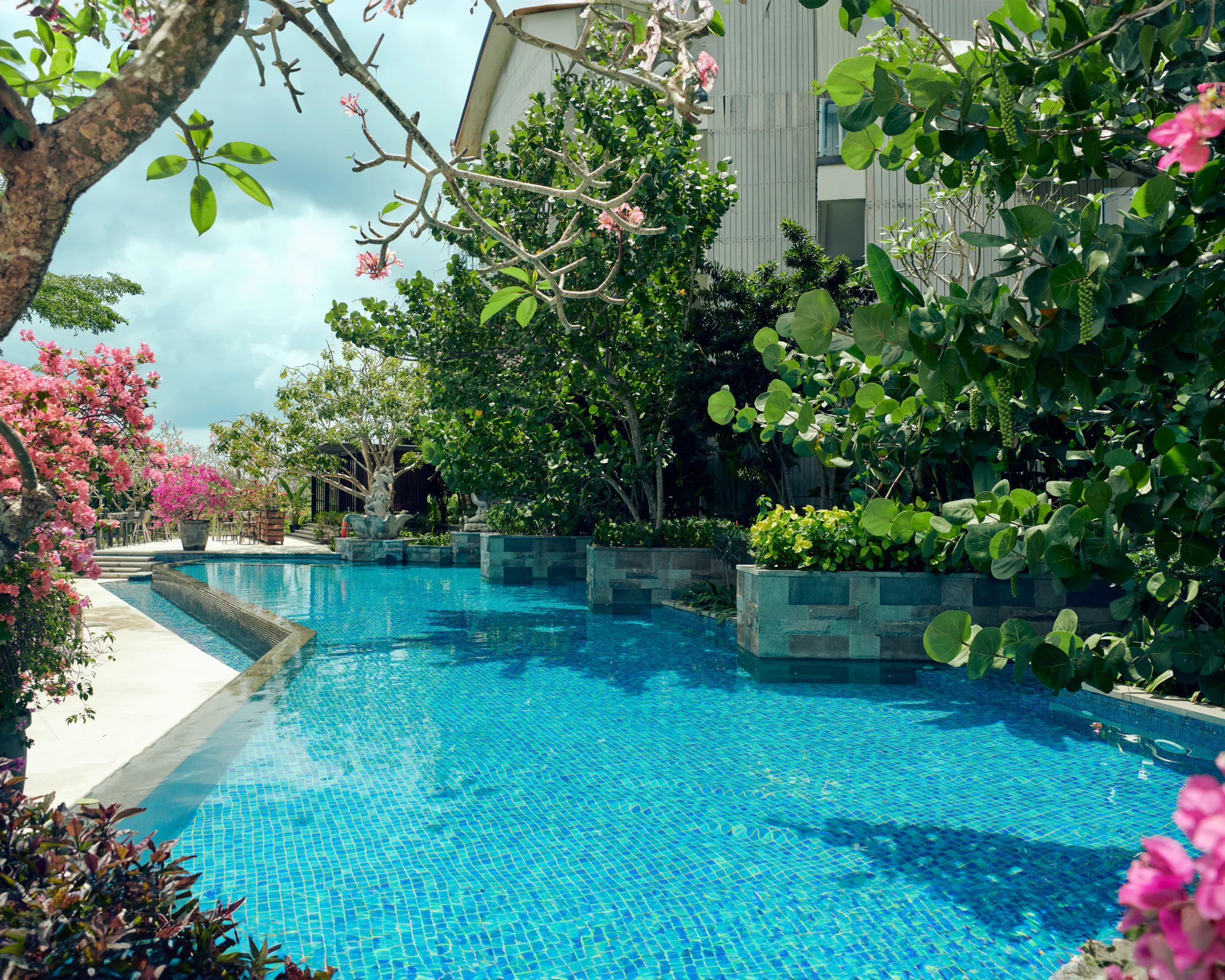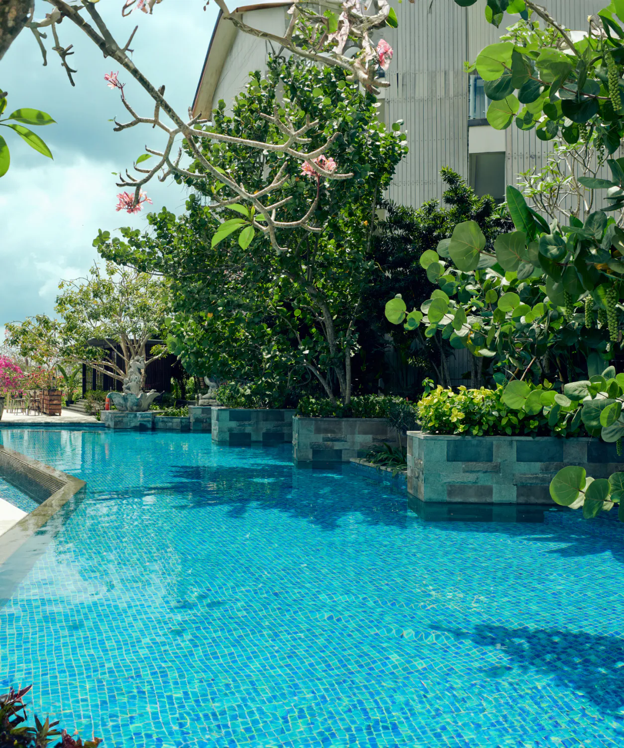 The pool, nestled like an oasis in the forest beyond RIMBA, offers a sensation of floating amid the trees.