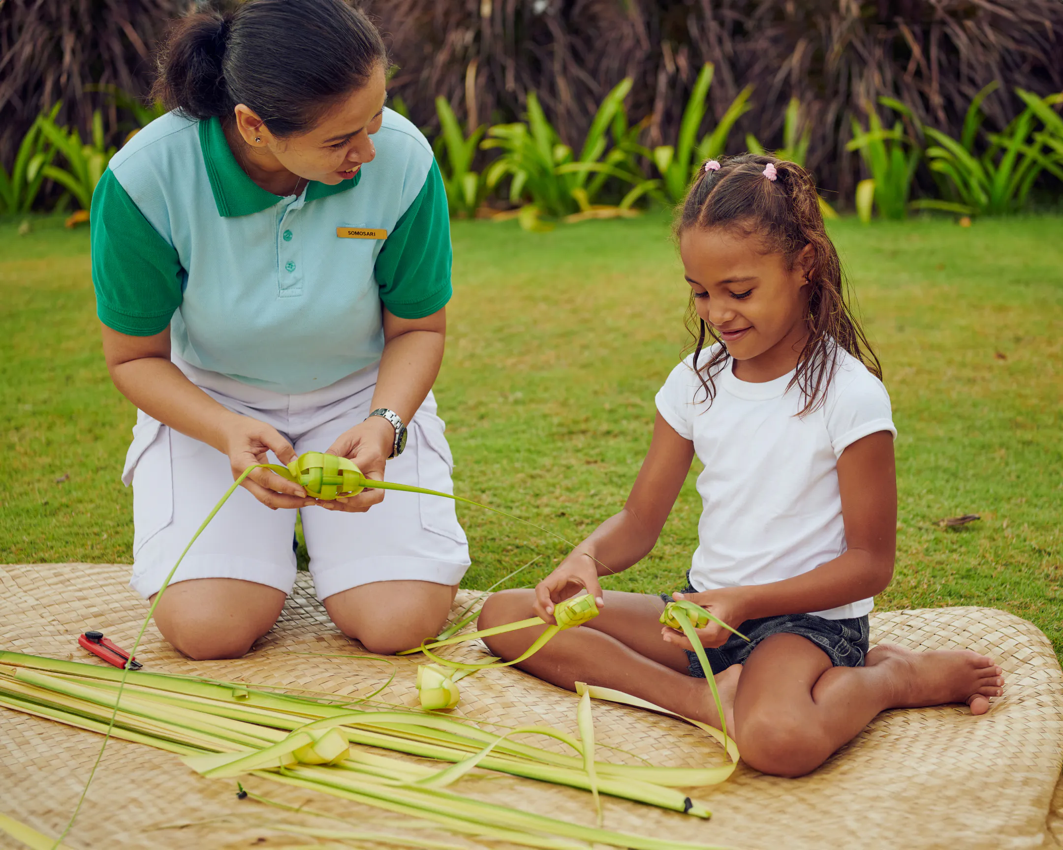 Learn to weave young coconut palm leaves into decorative shapes such as birds, turtles, squares, or gongs.