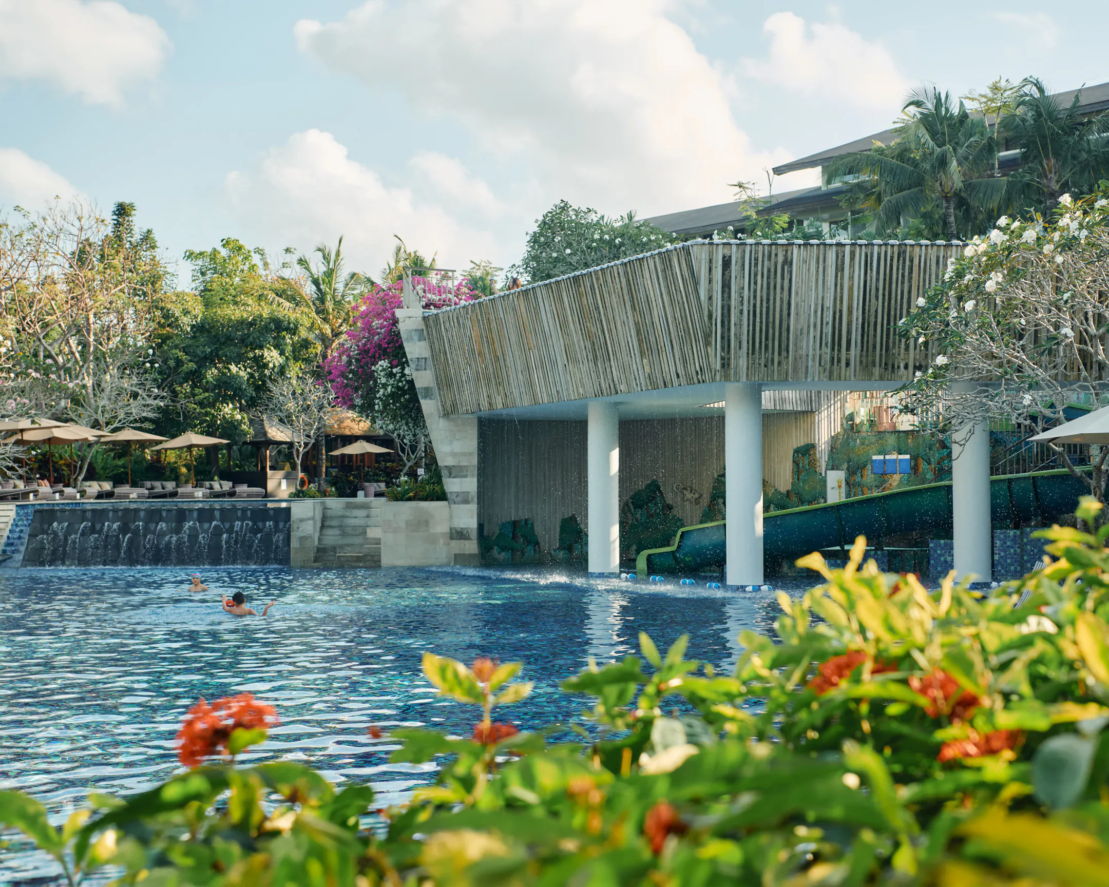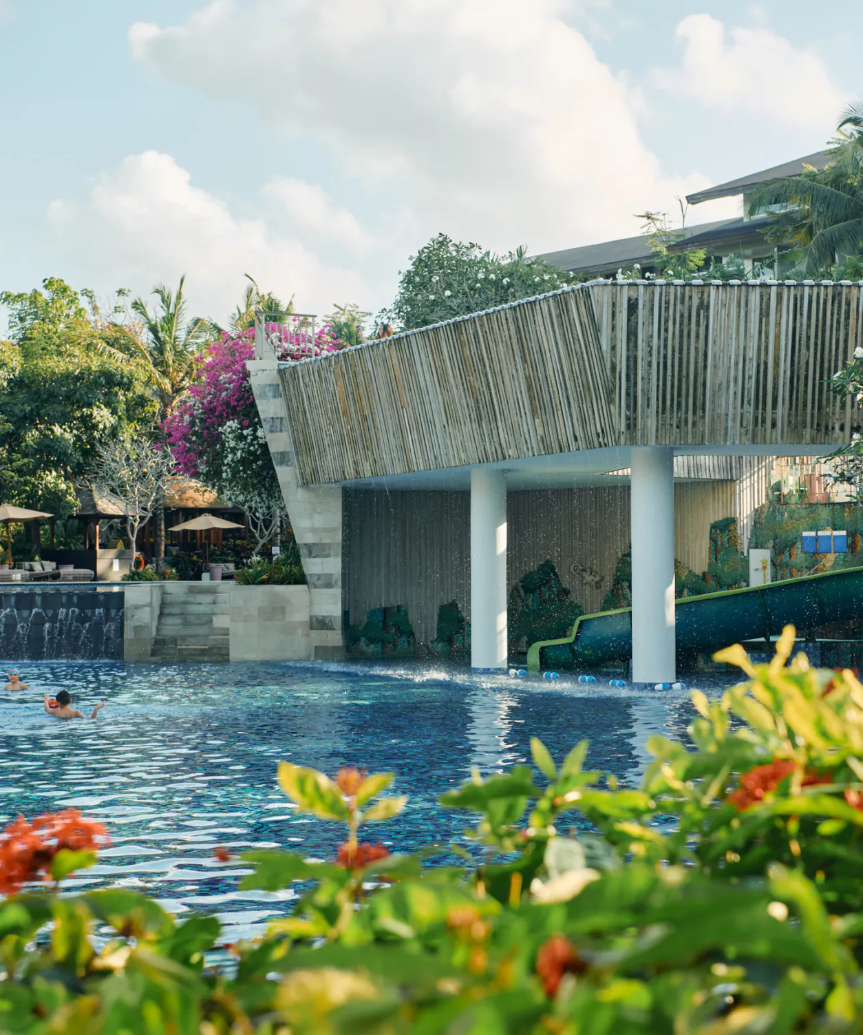 Featuring a thrilling waterslide and a swim-up bar.