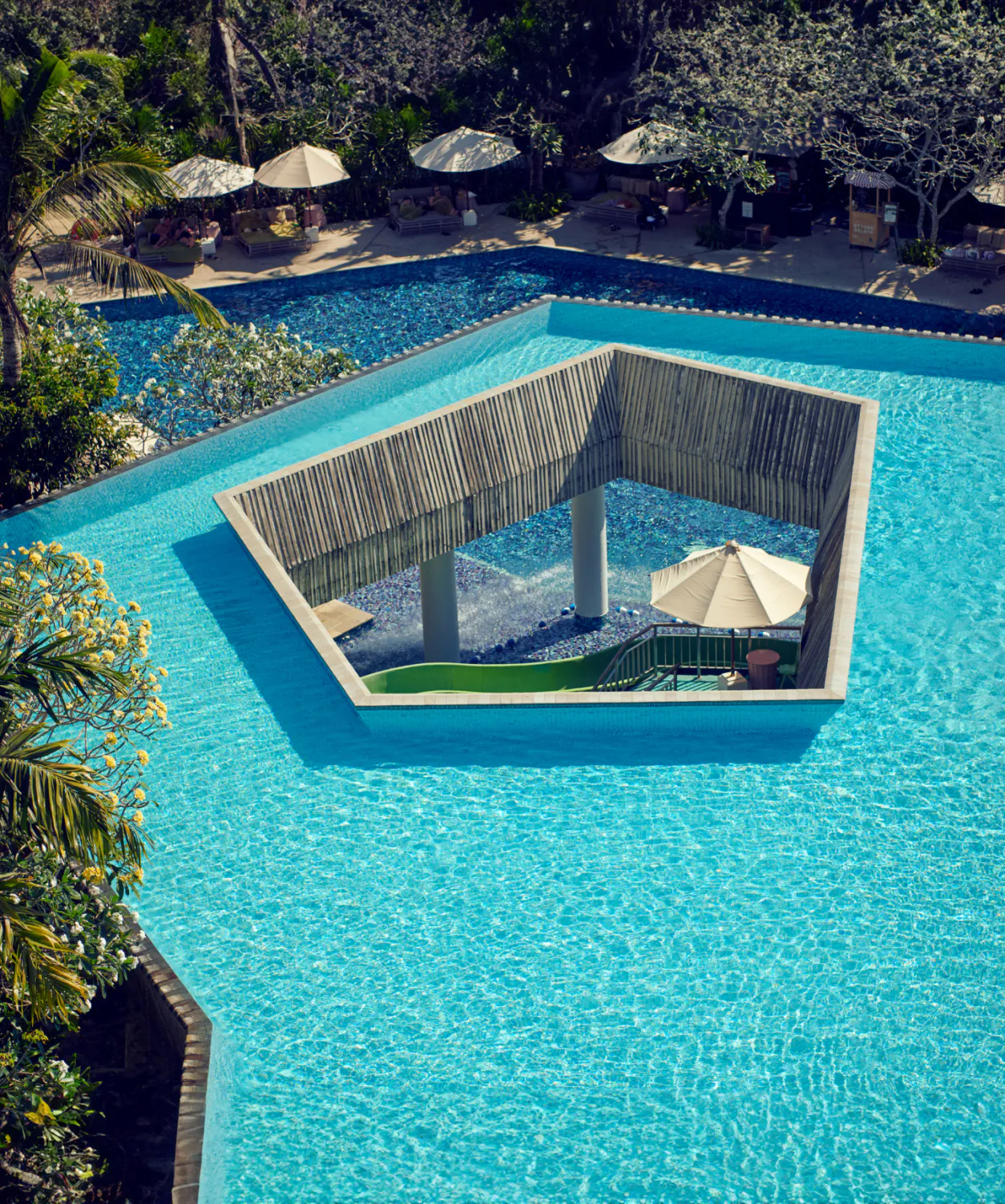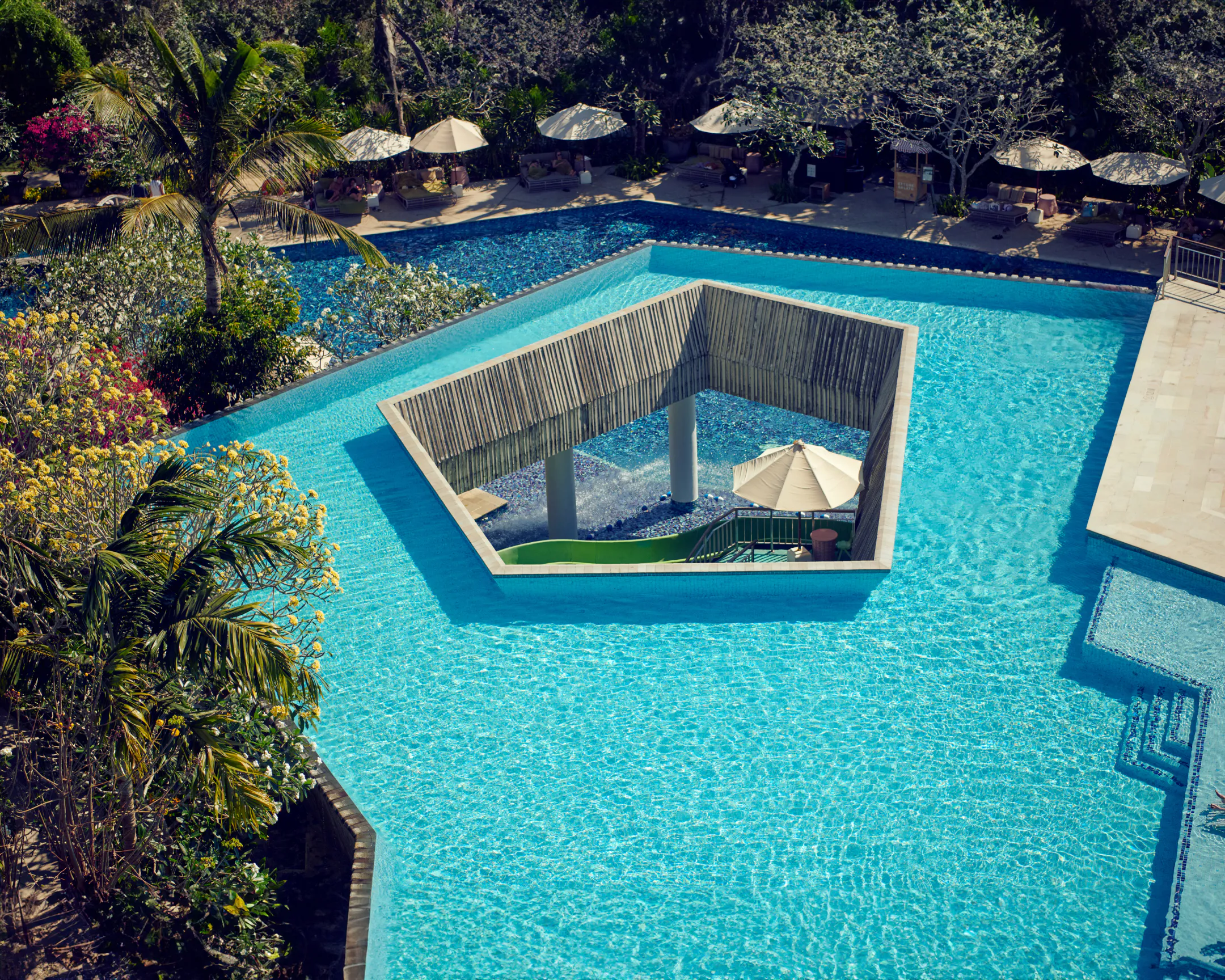 Poolside bar amidst shimmering blue waters.