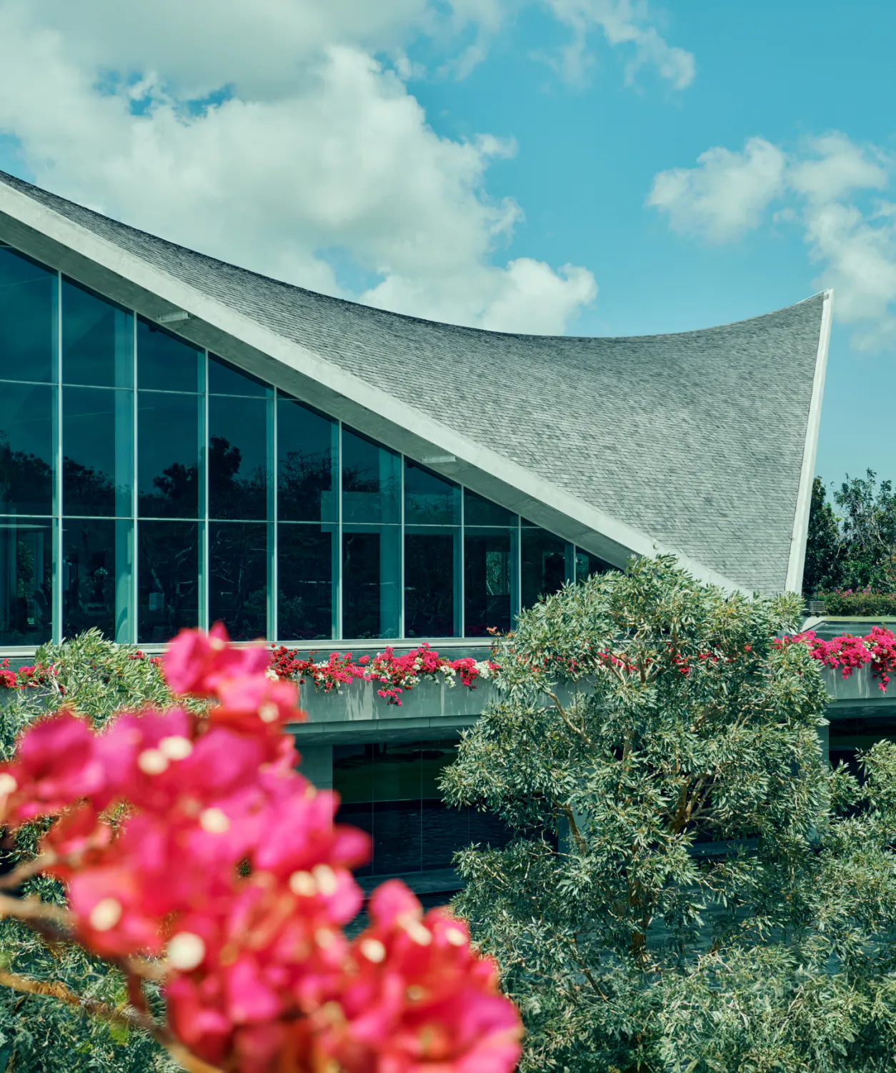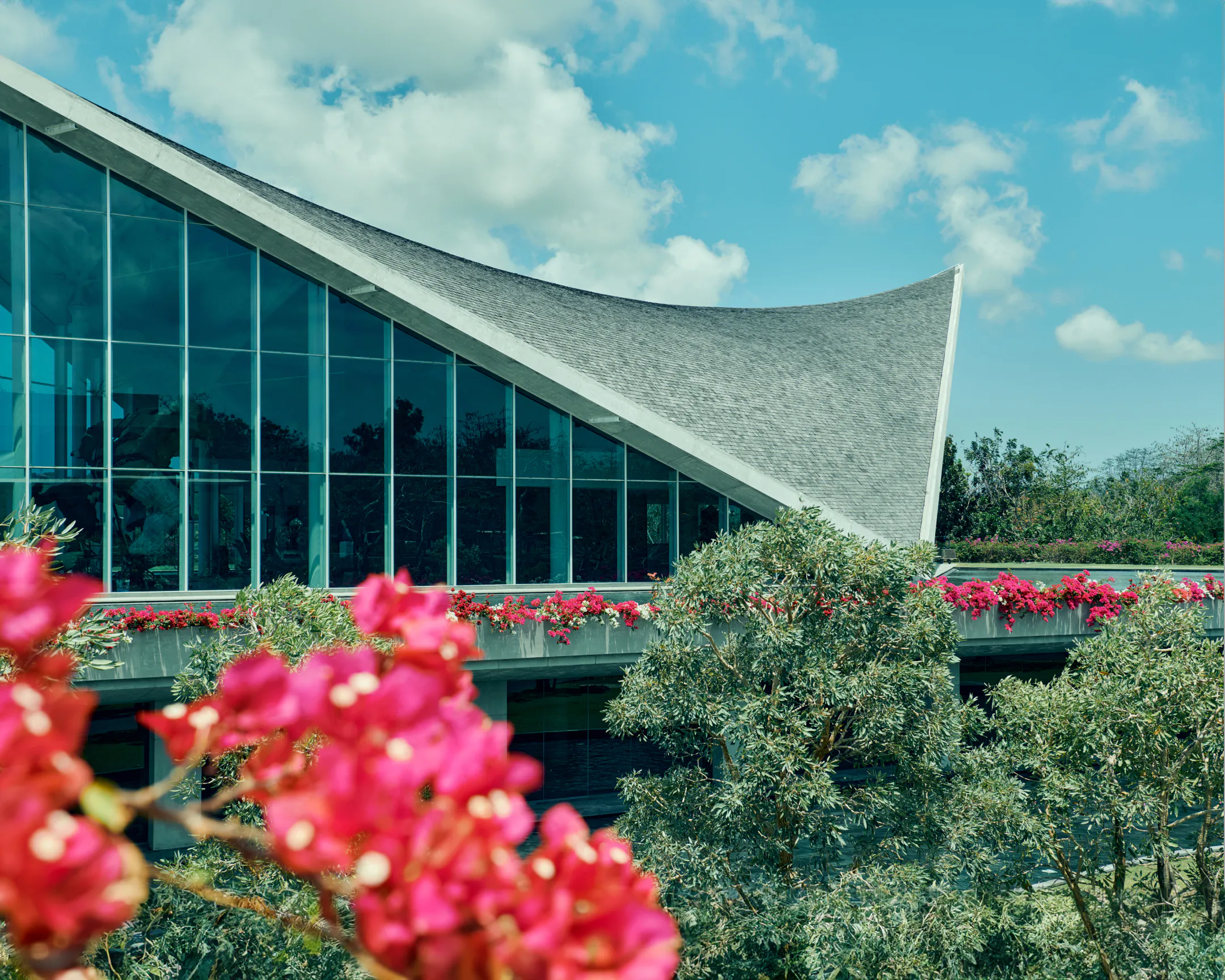 A glass-walled venue offering panoramic 180-degree views of the Indian Ocean
