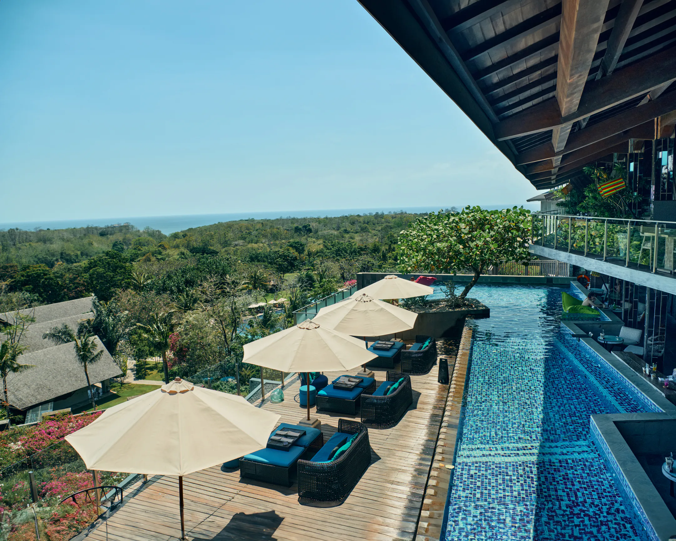 The view from the pool located on the rooftop of the RIMBA Hotel is breathtaking