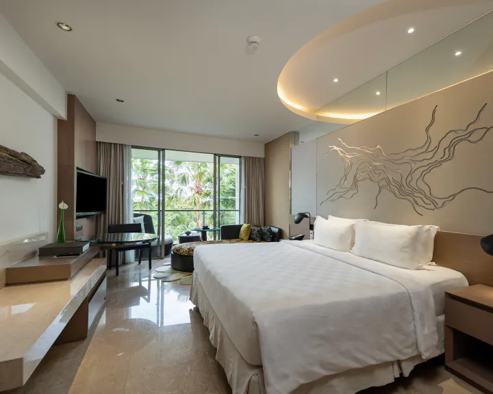 Introducing our spacious and modern RIMBA 2 Bedroom Resort View Room, seamlessly connected to nature with captivating views of the resort grounds. Spanning 84 square meters, this room combines nature-inspired decor with contemporary elegance. The marble bathroom features both a luxurious shower and a large soaking tub, perfect for unwinding. Ideal for families and couples, the room offers ample space and comfort. Enjoy unique perks like priority access to the Rock Bar for a truly special holiday experience.