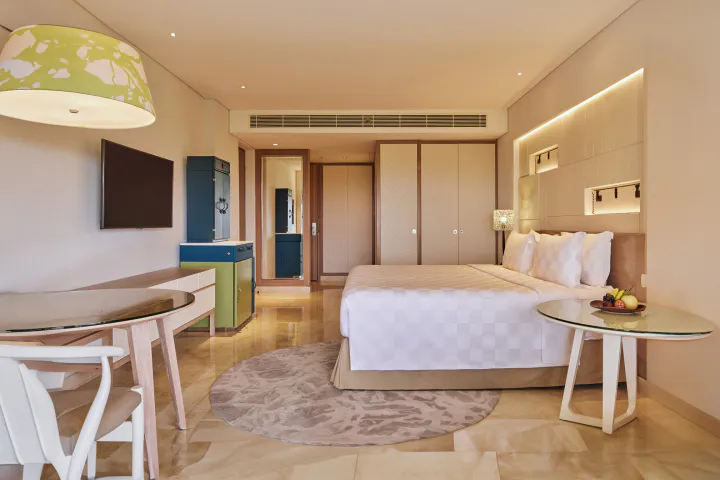 The 53-square-meter Wana Ocean View Rooms offer breathtaking ocean vistas. The serene interior boasts a modern design, seamlessly blending furniture and decor crafted with the skilful use of natural