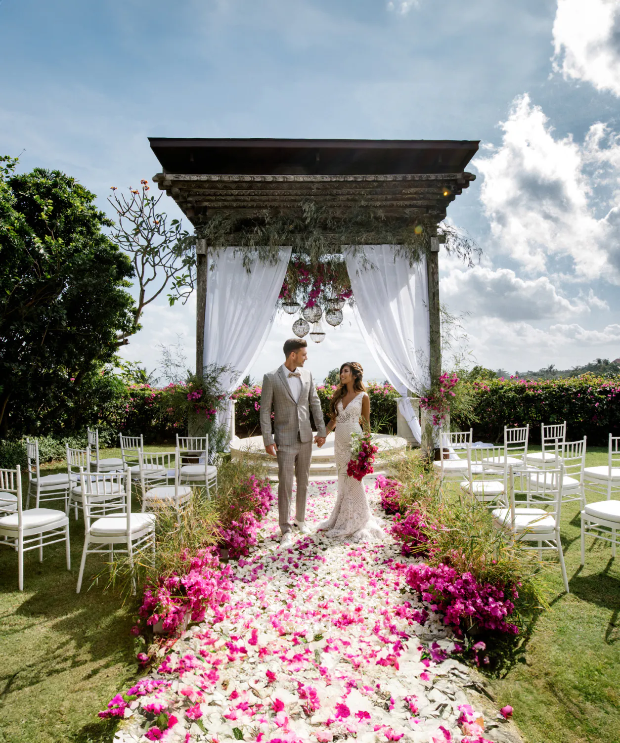 Swim-up bar with cocktails amidst vibrant bougainvilleas.